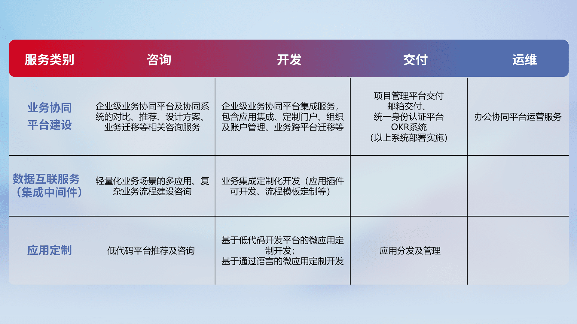 针对钉钉、、、、企微、、IDaas等平台级产品提供产品的规划、、方案、、交付、、、、定制化开发等服务,,实现如统一协同办公、、、智能客户服务、、、混合会议管理、、、智能数据查询、、等业务场景,,,实现数字化转型。。。。